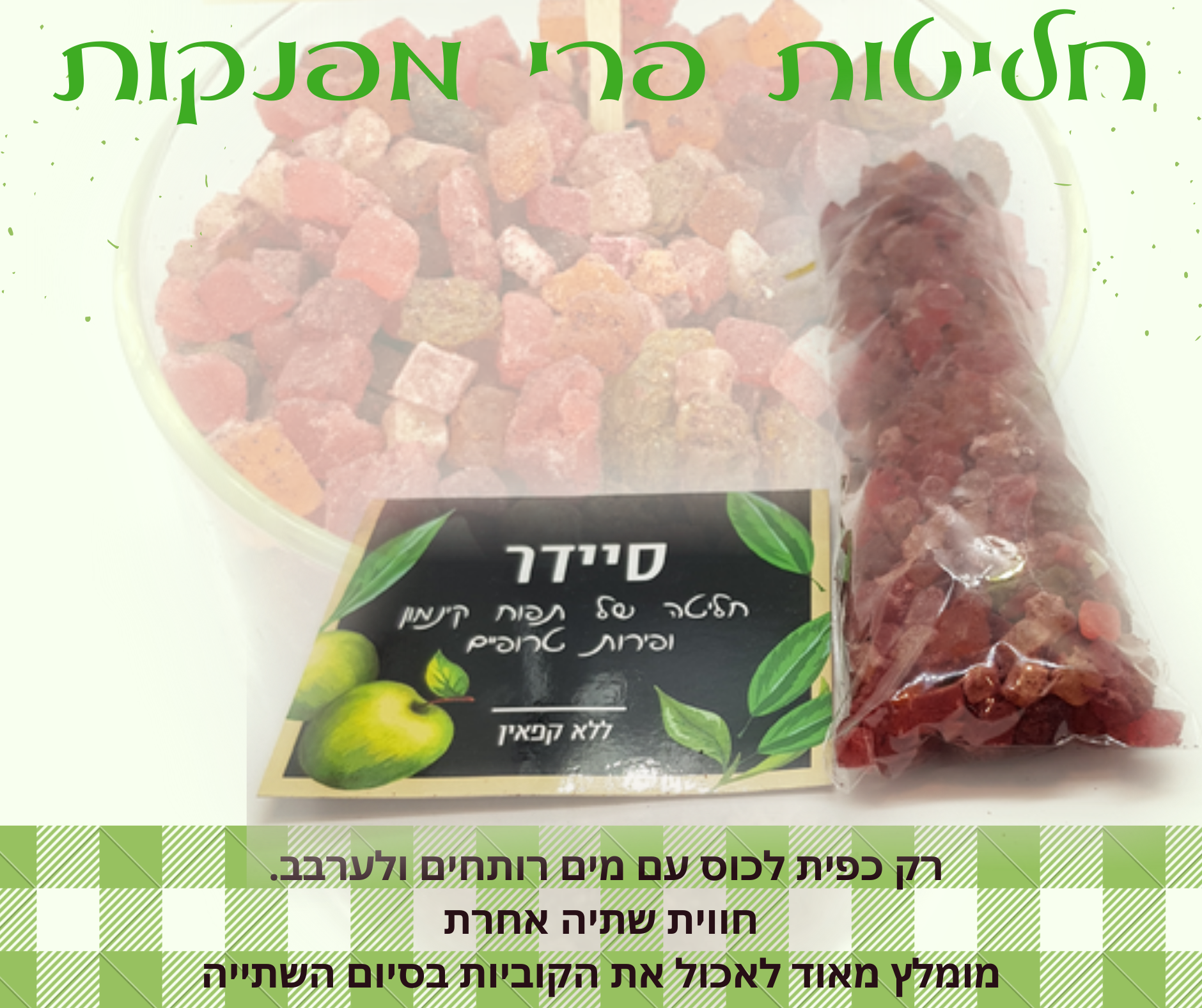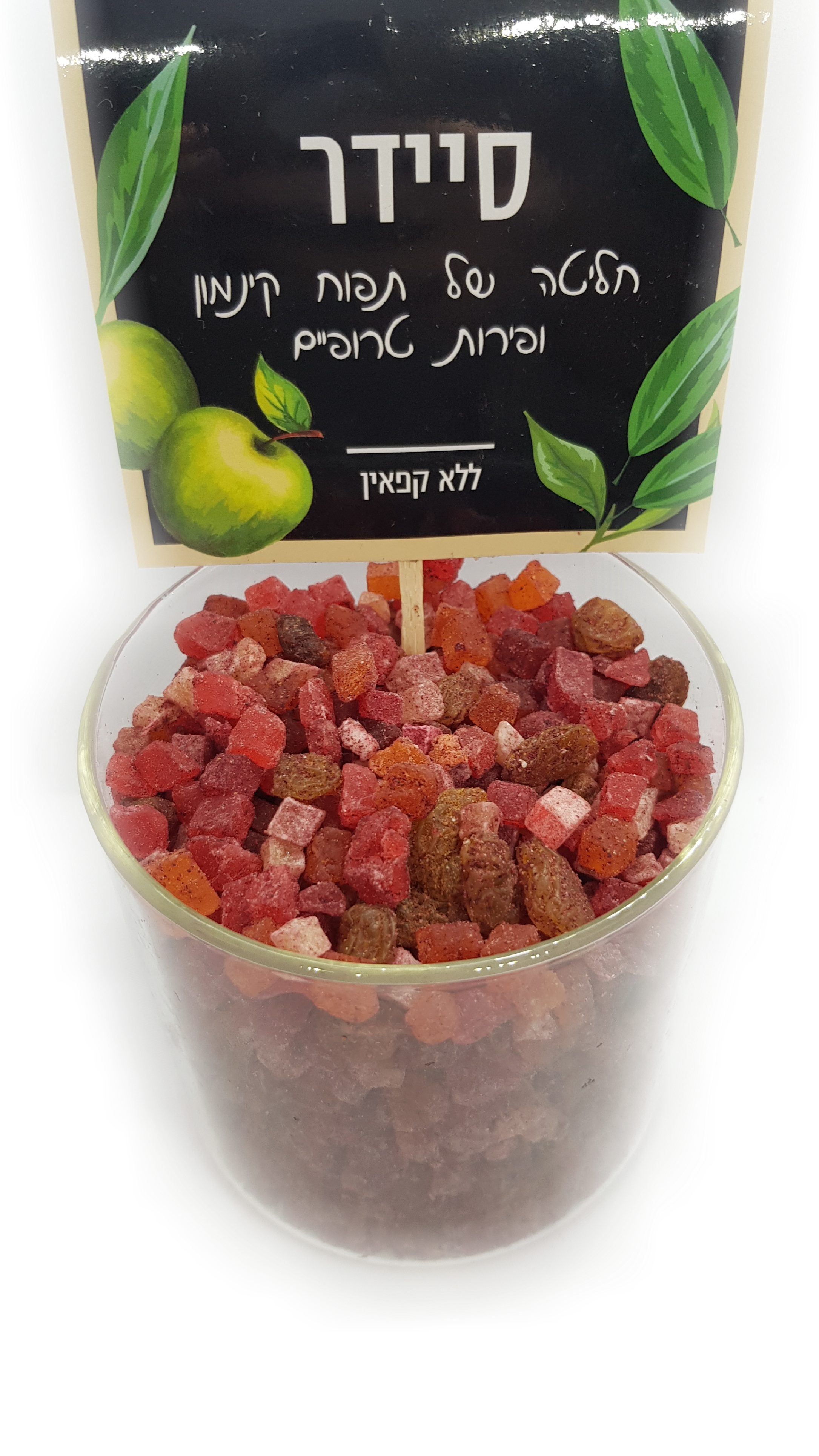 מכילה קוביות פירות, תפוחים, קינמון ופירות טרופיים