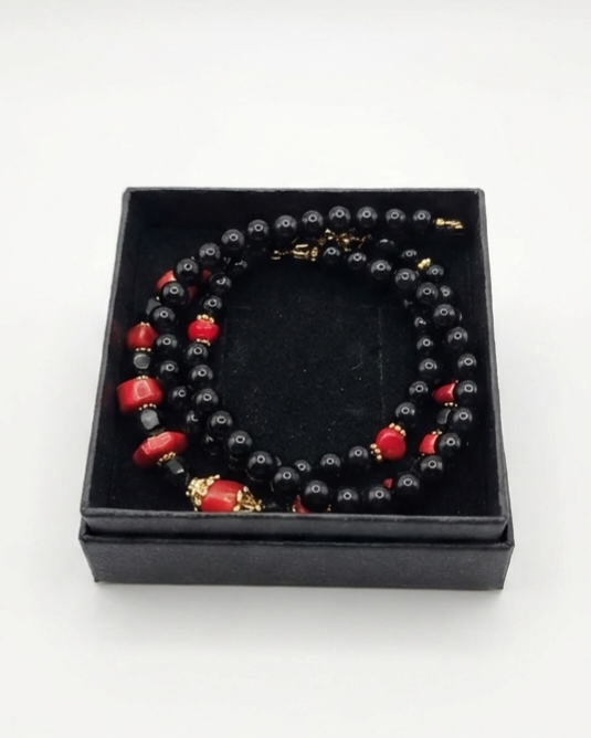 שרשרת חרוזים ארוכה בעבודת יד, עשויה אוניקס שחור טבעי בשילוב ג’ספר אדום, עם חרוזי מתכת עדינים להשלמת המראה.